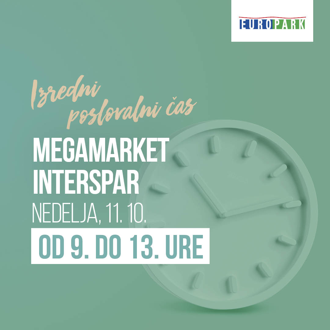 Izredni poslovalni čas Megamarketa Interspar 8 oktobra, 2020 By Vanja Bele Spoštovani obiskovalci, obveščamo vas, da bo Megamarket Interspar v nedeljo, 11.10.2020, zaradi inventure izjemoma posloval do 13. ure. Zahvaljujemo se vam za razumevanje. Share: Envelope Twitter Facebook